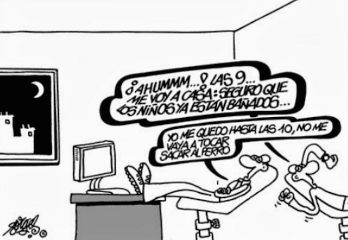 No te dejes intimidar por estar en la lista negra por trabajar tan solo las 40 horas de jornada que están firmadas en tu contrato (pagar las horas extras es algo que se hacía en el siglo pasado). Ellos utilizan tu miedo a perder el trabajo para poderse quedar más tiempo en la oficina.