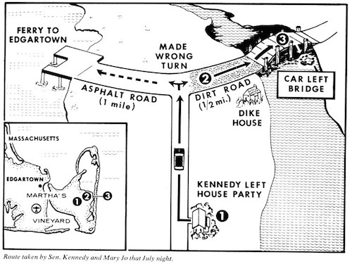 A las 23:00 Ted y Marie Jo abandonan la fiesta. Se dirigen en el coche de Ted al ferry que les llevaría a isla de Vineyard.